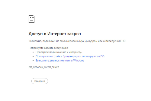 То есть будет ERR_NETWORK_ACCESS_DENIED. Тогда это точно ваша ошибка и ищите врубленный VPN или прокси.